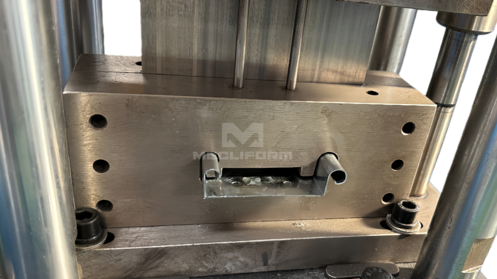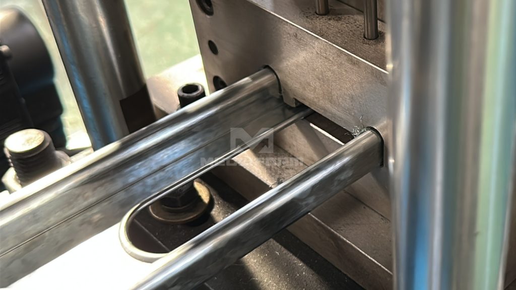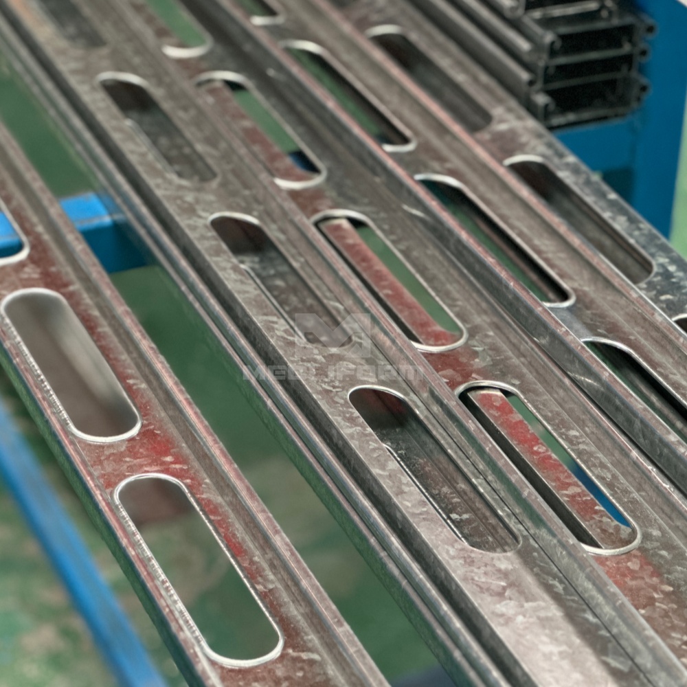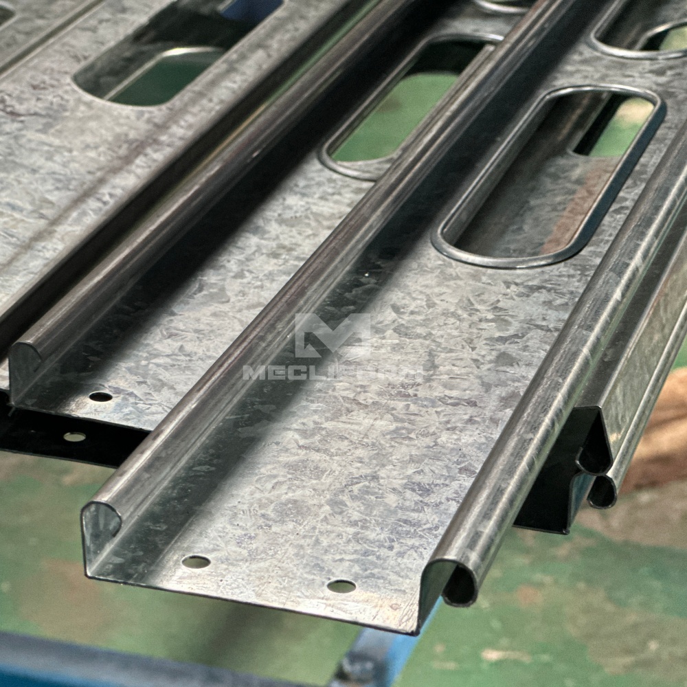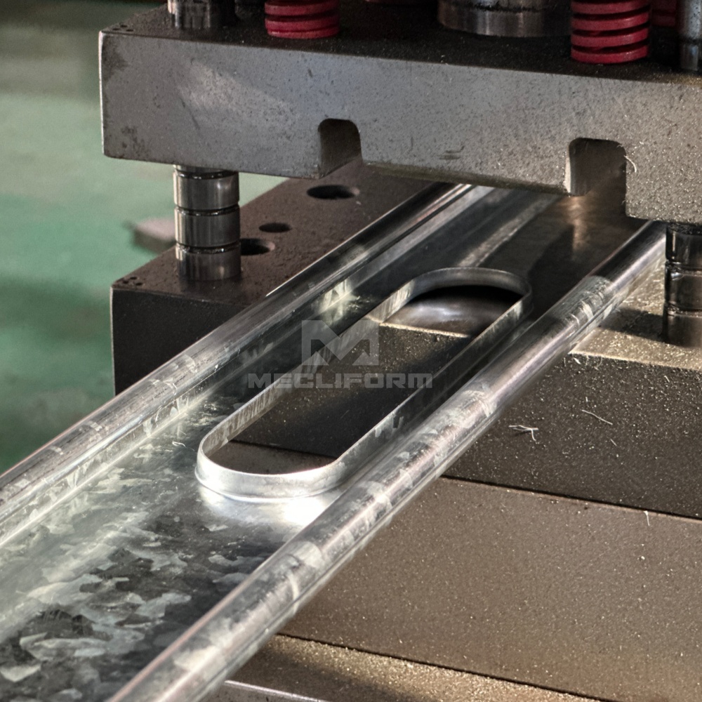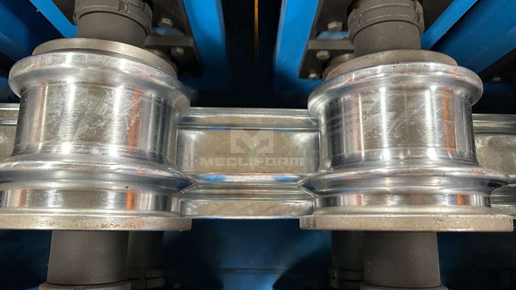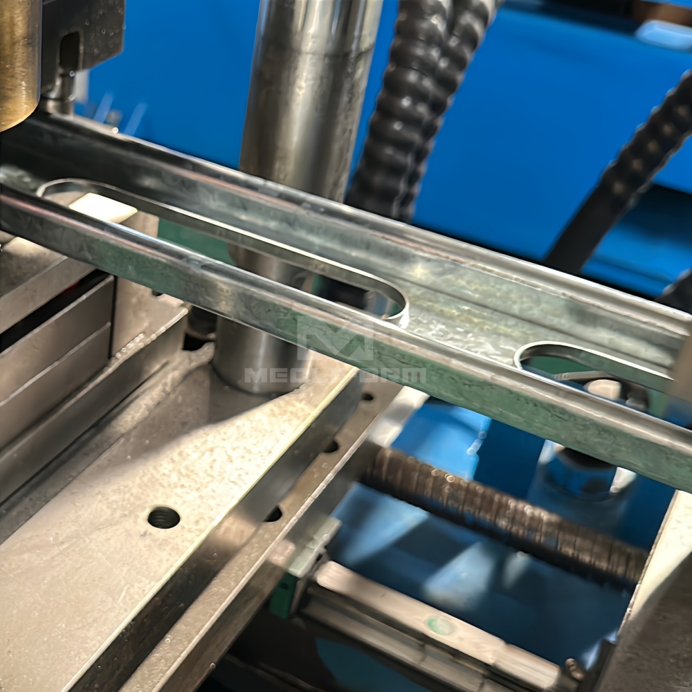 Punching & folding unit is used to punch holes, meanwhile folding and pressing after roll forming. It typically consists of metal tools that are propelled with force through the slats to create the desired hole or shape.